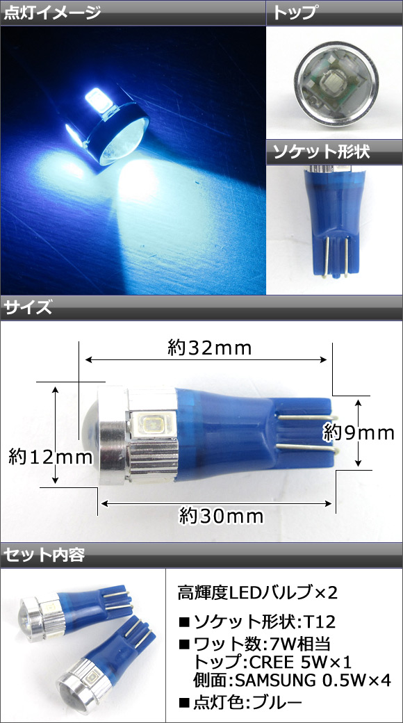 AP 高効率LEDバルブ ブルー CREE製/SAMSUNG製チップ採用 5連 7W相当 T12ウェッジ AP-HPT12-7W-5B 入数:2個 |
