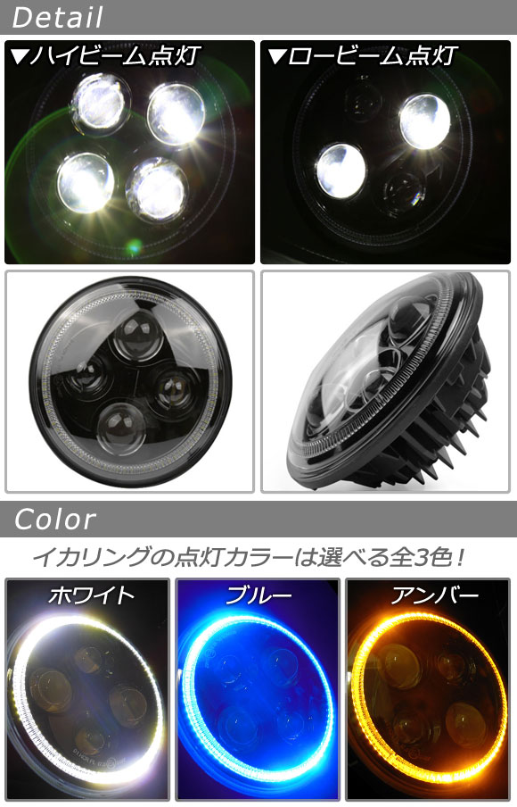 LEDヘッドライト 7インチ 12/24V Hi/Lo イカリング ハーレーやジープ等幅広く対応 選べる3カラー AP-LL025 |
