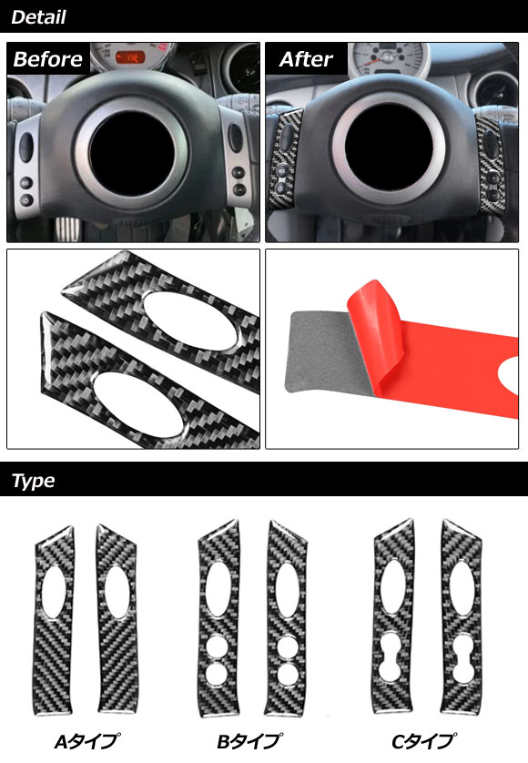 ステアリングスイッチカバー MINI(BMW) R50/R53 2001年〜2009年 ブラックカーボン カーボンファイバー製 Aタイプ 入数:1セット(2個) AP-IT3083-A |