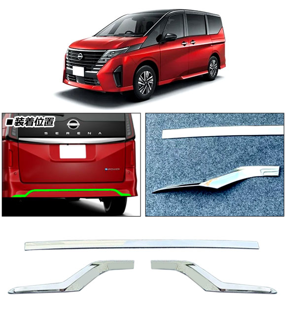 リアバンパーガーニッシュ 日産 セレナ C28系 ハイウェイスター専用 2022年12月〜 鏡面シルバー ABS製 入数:1セット(3個) AP-XT2436 |